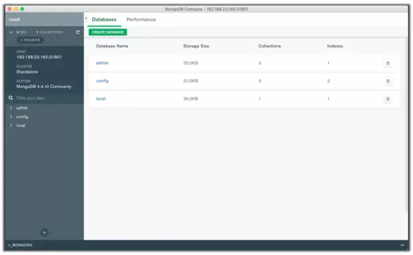 为 MongoDB 应用暴露一个 NodePort 类型的 Service,端口号为 31801,然后在本机通过 MongoDB Compass 连接它(192.168.23.160:31801):