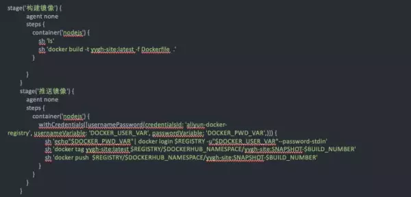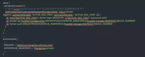 基于该凭证,我们在 Jenkinsfile 中编写镜像推送的代码如下: