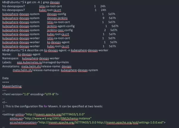 流水线的第二个阶段通常是项目的打包与编译。 默认情况下,Maven 从官方仓库下载项目依赖,如果想要修改默认镜像仓库,需要修改集群中名为 ks-devops-agent 的 ConfigMap,它拥有一个叫做 MavenSetting 的键: