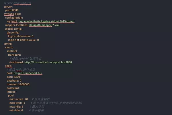 这意味着该子项目在启动时,会激活 prod 环境,并从 Nacos 中读取 service-cmn-prod.yml 文件作为启动配置。 因此,我们首先需要在 Nacos 中创建其生产环境配置文件 service-cmn-prod.yml,然后将 子项目路径 / src/main/resources/application-dev.yml 的内容复制进去,在其基础上修改。 需要修改的内容主要是中间件的访问地址。 以 service-cmn 为例,它的配置文件被命名为 service-cmn-prod.yml,其最终内容如下: