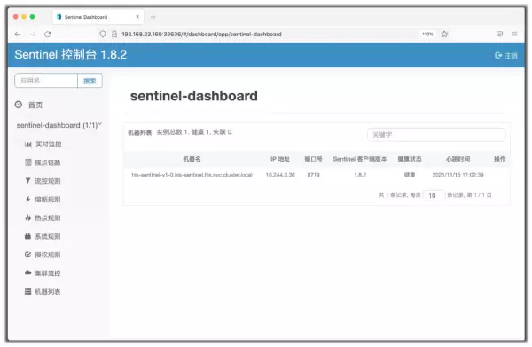 对于 Sentinel,我们直接使用雷丰阳已经制作好的镜像 leifengyang/sentinel:1.8.2,然后暴露一个 NodePort 类型的 Service,端口号为 32636。 访问 http://192.168.23.160:32636,以默认用户 sentinel 和默认密码 sentinel 登录,可以进入 Sentinel 控制台。 如果一切顺利,应该可以看到类似的页面: