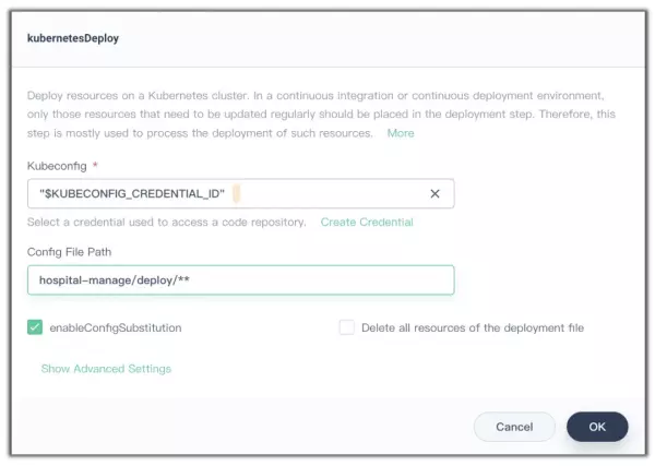这意味着我们需要在 his 项目中创建名为 aliyun-docker-hub 的 Secret。 注意,这里是在为 his 项目创建 Secret,而先前是在 DevOps 的项目设置中创建 Credential。二者的服务对象是不同的。 对于部署这个操作,我们可以直接在 UI 上选择 “添加 kubernetesDeploy”:
