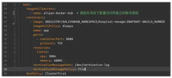 流水线的最后阶段是部署到开发环境和生产环境。因为这一阶段需要和 Kubernetes API Server 打交道,所以需要指定 Kubernetes 上下文 5[3]。 KubeSphere 自动为我们创建了名为 demo-kubeconfig 的凭证,该凭证提供了形如 .kube/config 的文件,使得我们可以根据凭证发起 kubectl apply 命令。 与此同时,我们还需要指定待部署的资源清单文件的位置。 以子项目 hospital-manage 为例,它的资源清单文件在 yygh-parent/hospital-manage/deploy/ 目录下。 观察该目录下的 deploy.yaml 文件,可以发现它要求集群从阿里云私有镜像仓库拉取镜像,需要我们提供 imagePullSecrets 字段: