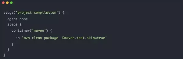 我们通过命令 mvn clean package -Dmaven.test.skip=true 进行项目打包编译。由此,流水线的第二阶段需要执行的命令如下: