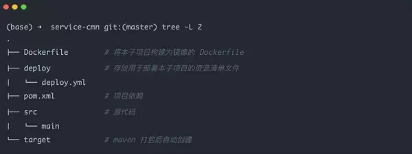 以上 12 个待部署的子项目将以独立 Pod 的形式在集群中部署。 每一个子项目根目录需要具有一个 Dockerfile 文件以及一个名为 deploy 的文件夹。 前者是本子项目的镜像制作文件,后者是本子项目的资源清单文件 *.yaml(用于在集群中部署)。 以 service-cmn为例,其文件布局如下: