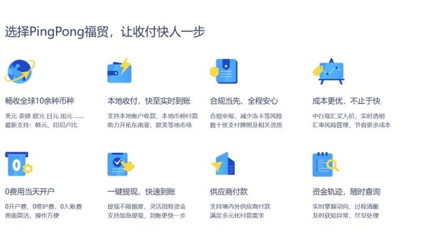 作为一站式跨境电商和外贸商综合服务平台,PingPong福贸业务覆盖200+国家,支持全球18个币种,0 费用、当天即可开通全球收款账户、本地收款账户,助力外贸企业收付畅通无忧,提升企业资金周转效率。