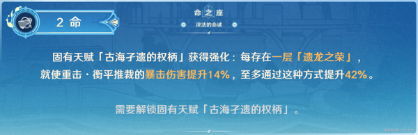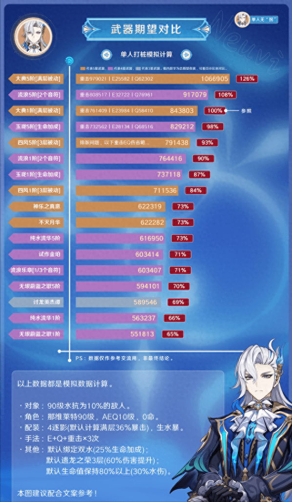 配合1命和固有1的机制,只要能满足那维莱特阵容体系可触发出2种与水相关的反应,固有1直接给60%的伤害提升,2命直接给42%的暴伤加成,在携带专属武器「万世流通大典」时,最终收益可以给出12%左右的伤害提升 ,并不算多。