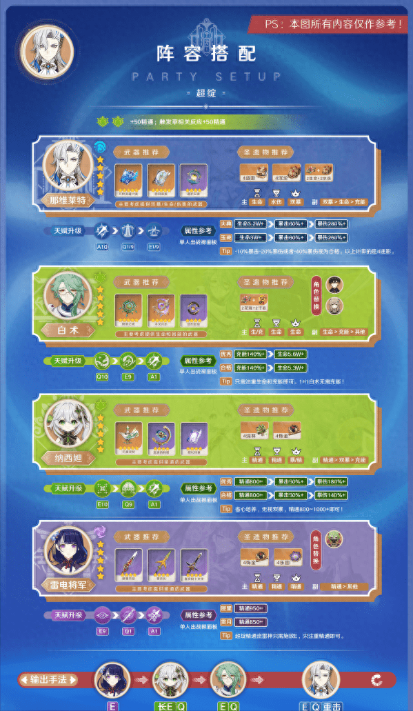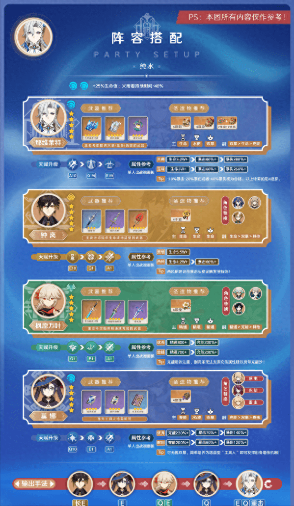 如果实战还是缺回能“卡手”,那维莱特自身没专武也没充能的情况下,不妨考虑西风钟离、西风莫娜、西福斯万叶,基本不担心回能问题,钟离、万叶、莫娜位置都标注了角色替换的下位考虑。