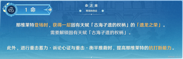 固有1提供的「遗龙之荣」 效果与那维莱特的伤害息息相关,也直接性的影响了那维莱特的阵容搭配。