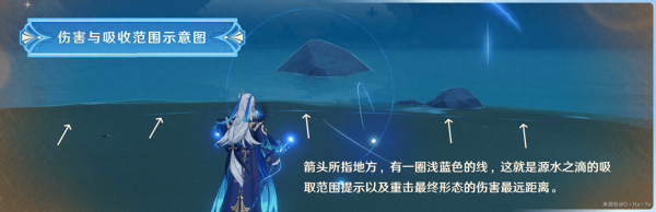 如上图标注,只要在这浅蓝色范围内存在水滴时都会自动吸收,当进入最终形态的重击时无需长按也不会取消最终形态的释放,而通过跳跃、冲刺可以取消,但一般不建议这么做。