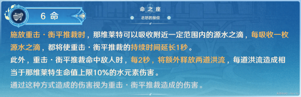 每次重击蓄力至多吸收3个水滴 ,相当于就能瞬间施放出最终形态的重击以及恢复48%的生命值 ,刚好与上文消耗40%生命值的机制相呼应,在没有外力伤害的情况下,那维莱特的消耗生命与恢复生命就形成了良好的循环互补。