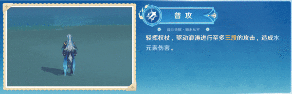 A 一共三段 动作,每次命中敌人都会造成水元素伤害,其附着能力遵循附着CD影响,大约2s ,具有附着能力的A命中敌人会对敌人施加弱水附着 。