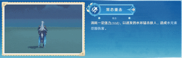 常态下的重击只会对敌人造成1次水元素伤害并施加弱水附着,且会消耗体力,实战中并不建议使用常态下的重击 。