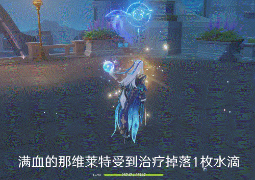 如上图,即使是满血的那维莱特,只要是受到了治疗就能产生1枚水滴。