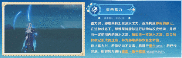 触发重击的最终形态由重击的蓄力机制支持 ,分为常态下的超长蓄力 和吸收「源水之滴」 (简称“水滴”)的瞬间释放两种模式。