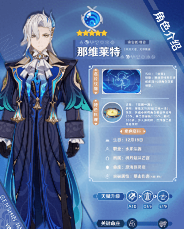 那维莱特 ,枫丹最高审判官,5星水系法器角色,通过完成日常委托、消耗体力、尘歌壶入驻、完成突发任务等方式可获取角色好感度,当那维莱特的好感度达到10级时可在角色页面领取专属名片纹饰——「流澜」 。