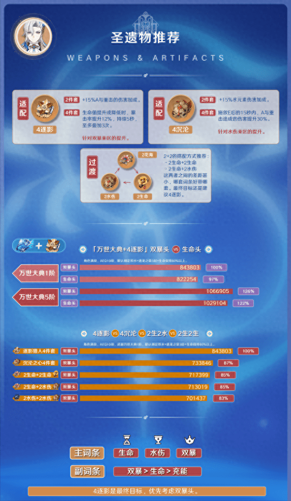 ⭐圣遗物方面,目前而言,4逐影是最终目标,未成型时,若有成型的4沉沦可以过渡,都没成型时可用生命2件套与水伤2件套的混搭方式过渡,不管是2水2生、2水2水还是2生2生,最终差距只有2%,哪套词条好先用哪套过渡即可,主词条优选生水暴,副词条主双暴次生命。 (与阵容和武器之间的搭配会在生命头以及生命词条占比出现不同情况,这里只是笼统大方向)