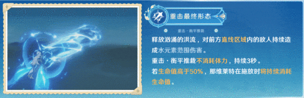 最终形态的重击会以强大的激流持续攻击前方直线区域内 (范围)的敌人,伤害受益于自身的生命值上限 ,生命值这个属性将会是那维莱特最主要的属性之一。