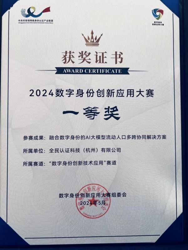 此次大赛,全民认证“融合数字身份的AI大模型流动人口多跨协同解决方案”,凭借顶层设计、建设方案、技术创新、市场效应四个维度的创新思维和实战实效,在2024数字身份创新应用大赛中,从69份参赛方案中以优异成绩脱颖而出,与中移动金融科技有限公司的“基于5G SIM卡的可信数字身份应用”并列一等奖,由中国工程院孔志印院士颁奖。