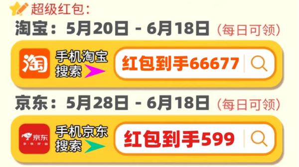 红包领取时间:淘宝5月20日-6月18日;京东5月28日-6月18日。