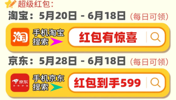 红包口令秘籍:今年的京东618红包口令是「红包到手599」,淘宝618红包口令是「红包有惊喜」,记得每天去领,因为领的红包大小和你搜索的什么口令有关哦!
