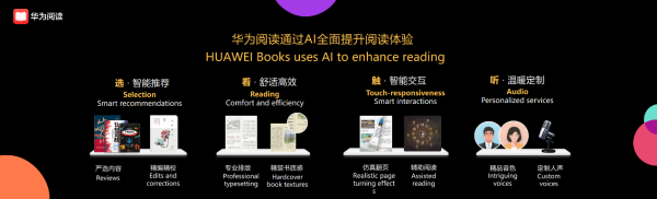 在选书环节,华为阅读基于内容推荐大模型,通过AI智能分析用户行为习惯和偏好,准确识别用户的需求和使用场景,主动为用户推荐合适的书籍。