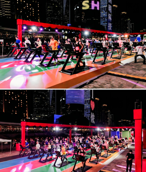 活动现场,人们热情洋溢,挥洒汗水,体验舒华提供的40台X5 Pro豪华智能跑步机带来的运动快感,共赴一万公里的浪漫接力。
