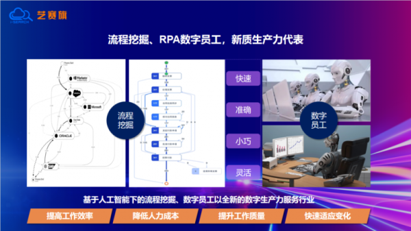 企业在数字化转型和应用新质生产力时面临诸多痛点,如系统负担重、数据运用难等问题。对此,艺赛旗的流程挖掘和 RPA 数字员工作为新质生产力的代表,具有快速、准确、小巧灵活且非入侵式的特点,能有效提高工作效率、降低成本、提升工作质量并快速适应业务变化。