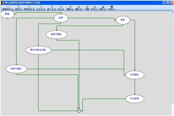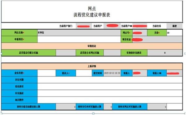(1)根据需求,设计“网点流程优化建议申报表”,实现了优化建议的上报、初审、复审、补充意见及发布等各环节。
