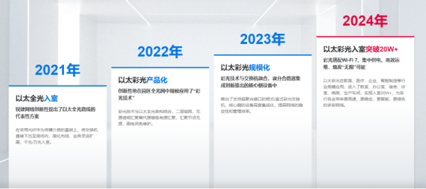 近几年来,“极简光”从1.0向2.X、3.0不断迈进,树立起以太全光领域的行业标杆。尤其在2.X阶段,锐捷将彩光技术运用到了园区网方案中,这一创新方案迅速赢得了诸多行业客户青睐,以太彩光逐渐成为园区全光网建设的主流选择。2024年,锐捷网络发布极简以太彩光解决方案3.X版本,以太彩光进入规模化应用阶段,进一步强化教育、医疗、办公、智能制造等企业级园区应用场景的竞争优势,在“彩光+Wi-Fi 7”、“彩光+供电”、“彩光+运维”等维度取得重大突破,驱动“以太全光”迈上更高台阶。