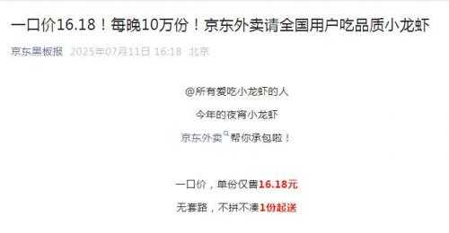 京东外卖发文:《一口价16.18!每晚10万份!京东外卖请全国用户吃品质小龙虾》,文内说明,认准京东App“秒送”频道,每晚10万份16.18元品质小龙虾。