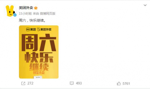7月11日晚,外卖“疯狂星期六”再次上演,美团外卖发布微博表示:“周六,快乐继续。”