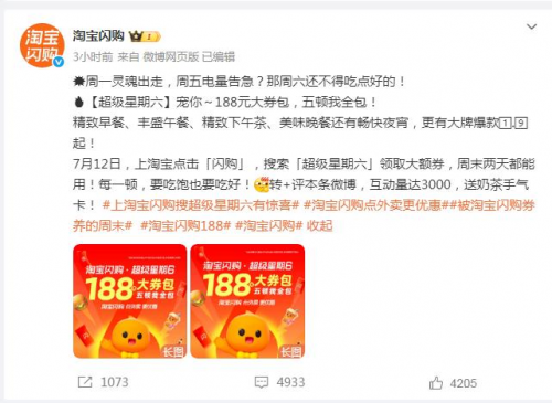 淘宝闪购表示,继续发放“超级星期六”188大券包。