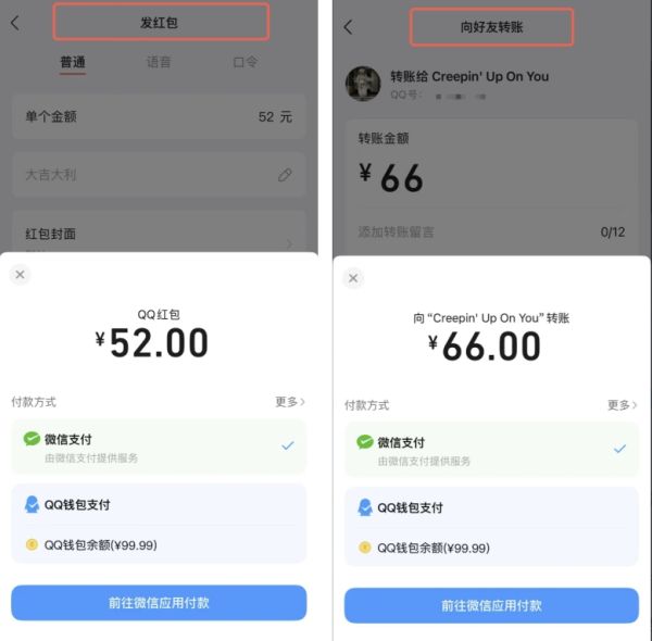 (在QQ内发红包、转账,均可使用微信支付)