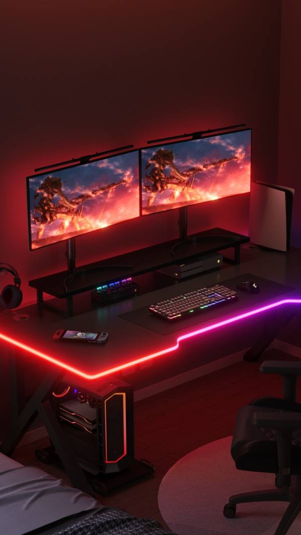 分段式流光幻彩技术灯效,单灯带内置28个/42个控光单元,可自定义动态光效和呈现多色渐变效果。配合反向发光设计消除传统LED光斑,呈现柔和光影效果。其柔性霓虹硅胶材料,支持自由裁切至1米/2米,精准适配各类桌沿曲面。