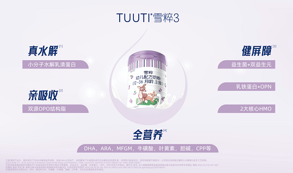 而面对需求不断深化的消费者,TUUTI雪粹3也并不止步单一功能,在优化蛋白质的基础上,还搭建了全面的营养矩阵,配置有OPO、益生菌、益生元、乳铁蛋白、CPP、OPN、HMO、6大脑眼营养群等,试图构筑“吸收+免疫+认知”多维一体的营养解决方案,为其在一众“小分子”奶粉中突出重围增强竞争力。