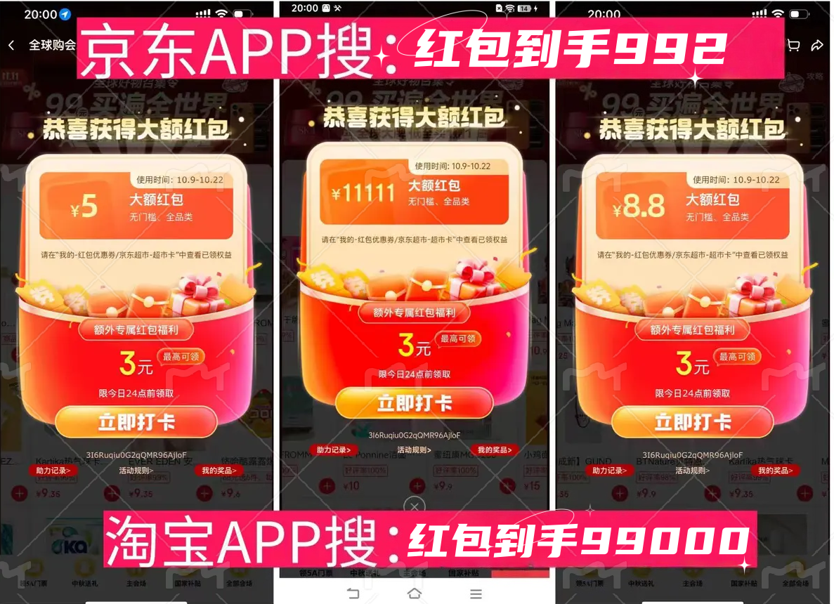 京东APP搜:红包到手992 (每天领三次!)10月9日开领一直到11月11日!红包最高11111元!