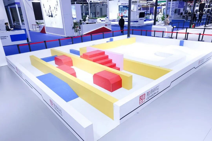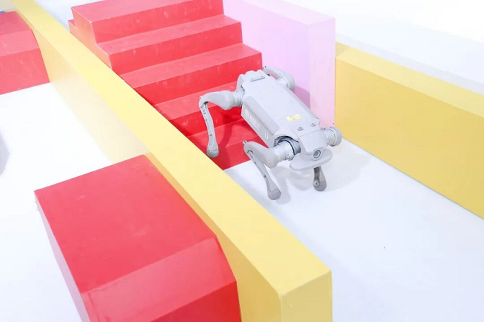 本次智身科技的展台内,还特别打造了一大“创新演示区”——通过精心设计的全新“跑酷赛道”,模拟真实作业环境中的复杂地形,由旗下明星产品“钢镚L1”在赛道内不停进行跑酷与表演。