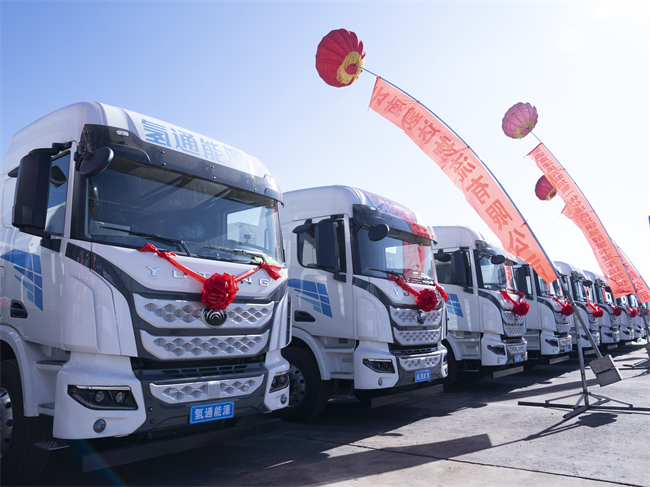 此次发车的300辆49吨氢能重卡,整车由宇通提供,搭载氢通能源130kW燃料电池系统,匹配262度宁德时代锂电池,在云南多山多坡的复杂工况下,有效提升能量回收与续航能力。车辆储氢量约37kg,百公里氢耗约8.5-9kg,在49吨标载综合工况下,续航里程突破600公里,并支持15分钟快速加氢。交付后,将依托富源县煤炭智慧物流园区投入到区域煤炭运输网络中,形成开放场景下的常态化运营。
