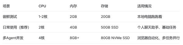 OpenClaw对硬件的基本要求其实不算高。最低配置是2核CPU + 2GB内存 + 40GB SSD存储,就能让一个基础版的OpenClaw跑起来。但注意,这个“跑起来”指的是最精简的文字对话模式——没有网页浏览、没有多任务并发、没有浏览器自动化。