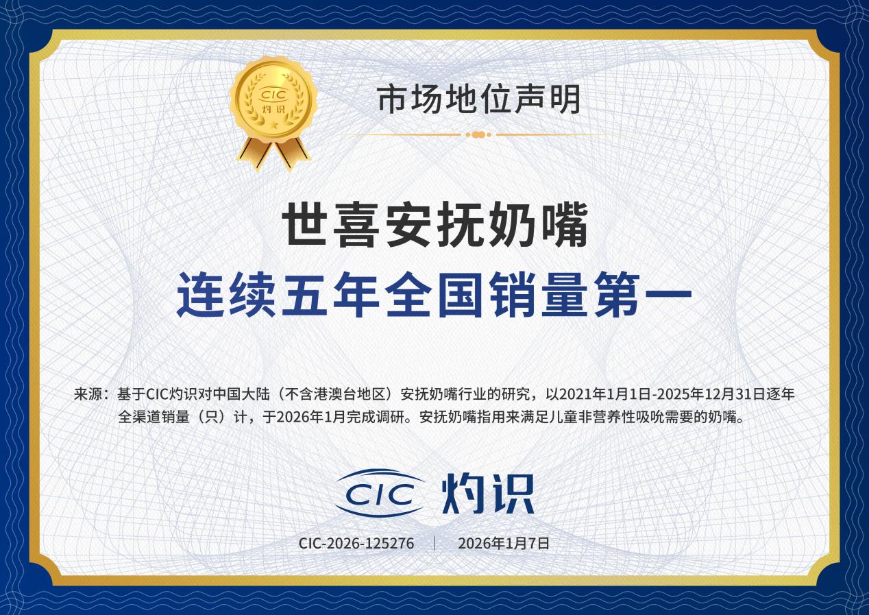 近日,国际权威专业咨询机构CIC灼识咨询发布市场地位认证报告,数据显示:世喜安抚奶嘴连续五年斩获全国销量第一的殊荣。这一认证不仅是对世喜品牌市场竞争力的高度认可,更印证了万千中国家庭对其产品品质与安抚体验的信赖与青睐,为母婴行业树立了品类发展的标杆范本。当下中国母婴市场正迎来消费升级的深刻变革,新生