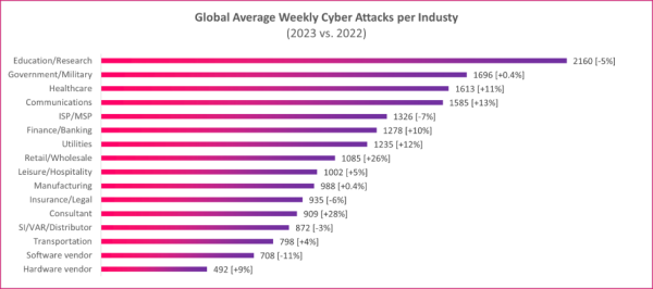 概要:•与去年同期相比,2023年前三季度全球平均每周网络攻击次数增加了3%。•全球医疗行业平均每周遭受1613次攻击,同比攀升11%。•亚太地区成为了重灾区,同比激增15%。•全球1/34的机构遭遇了勒索软件攻击尝试,与去年同期相比增加了4%。2023年底将至,每年的第四季度在全球范围内都是网络购
