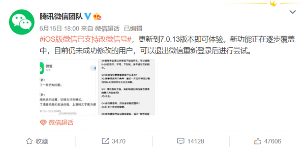 微信更新了7.0.13版本,iOS用户也可以修改微信号。此外,还加入了跟随系统设置切换深色模式、以及优化语音转文字消息的发送体验。随后,微信在iOS和Android版本都上线了“拍一拍”功能。据了解,这个“拍一拍”是一种提醒功能,在个人和群聊的对话场景中都可以使用。当你双击好友头像时,头像除了会抖动