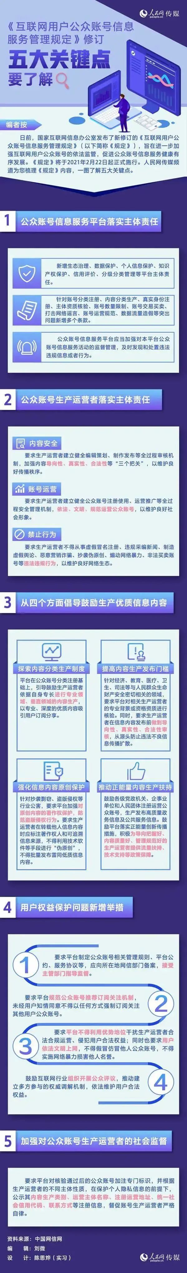A5创业网(公众号:iadmin5)1月25日报道,新修订的《互联网用户公众账号信息服务管理规定》于近日发布,其中有了不少新的规定和对原本规定的修改,大家快来看看吧。国家网信办消息称,新修订的《互联网用户公众账号信息服务管理规定》于2月22日起正式施行。公众账号是指互联网用户在网站、应用程序等网络平