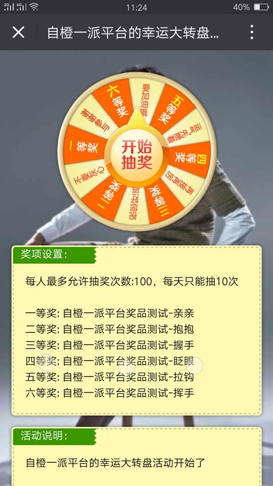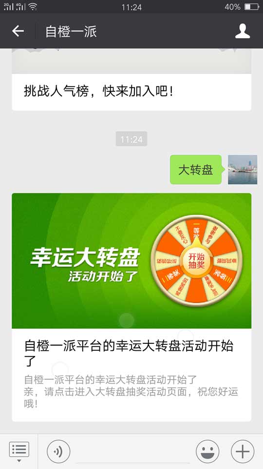 最后,往公众号里回复活动的关键词就可以参与活动了,如果想体验好一点,可以到自橙一派后台--基础设置--自定义菜单,将做好的活动添加到菜单里。