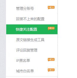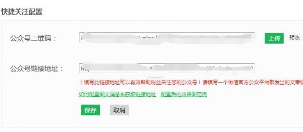 其次,绑定以后点击功能管理,左边快捷关注配置里面,设置一下关注公众号的链接(若活动不需要粉丝关注,则可以跳过这一操作)。