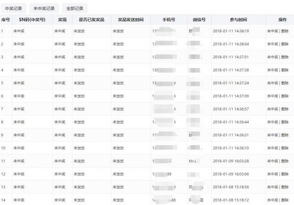 值得一提的是,制作后台点击SN码管理,可以查看中奖粉丝的信息,也支持导出excel表格方便本地查看。
