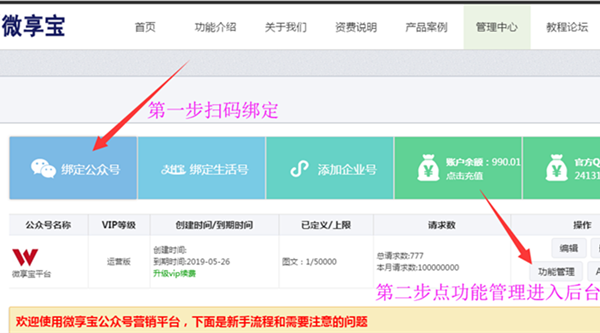 其次需要注册一个微享宝平台的账号,和自己的认证服务号对接,其他类型的公众号也可以,只能报名没有支付接口,完成后点功能管理进入到管理制作页面