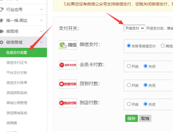 在左边微信商户--在线支付设置里,配置下自己的在线支付接口,上方有具体的教程,这里就不一一展开说明了