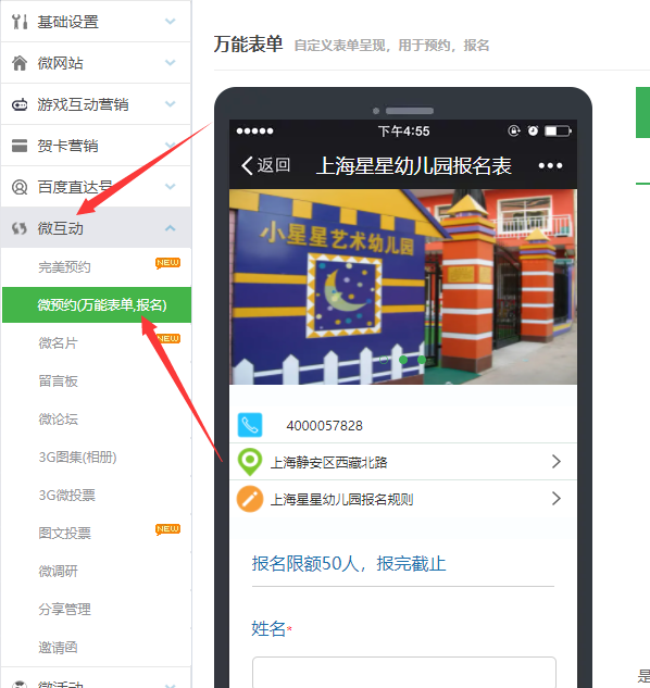 点击左边微互动--万能表单报名,在制作微信报名收费的时候,先编辑微信报名的标题、关键词等基础信息,这里主要是填写关于企业自己的信息,是否需要支付选择是,并填写好支付项目名称和金额,名额限制和每人限报人数编辑,完成点击保存,备注:微信收款直接实时到账微信商户平台。